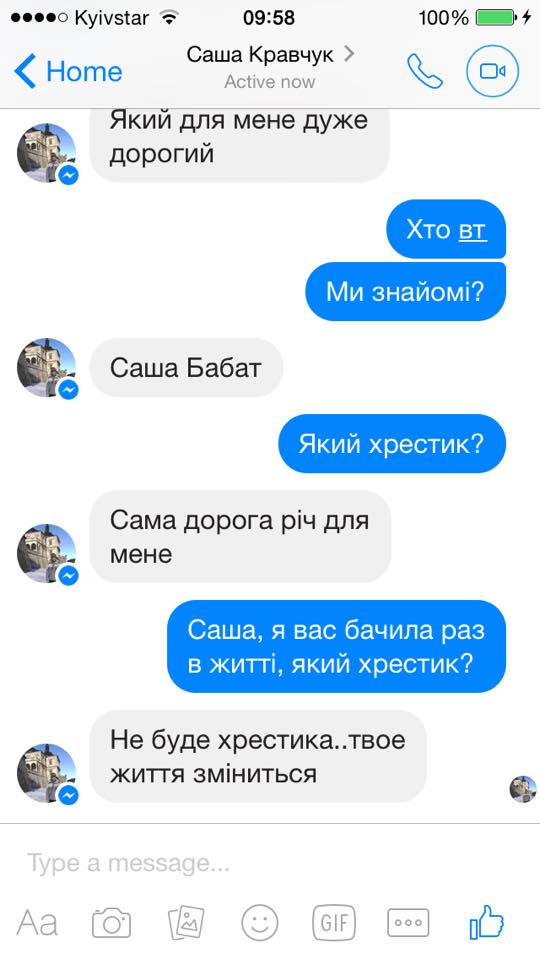 І ось. Тепер Олександр Бабат звинувачує мене УВАГА – сядьте, хто стоїть – в тому, що я вкрала в нього фамільного хрестика. Так, вам не здалось. Саме вкрала. Олександр Бабат обіцяє, що моє життя зміниться назавжди. Не питайте про шо він. Я не знаю. Це пише людина, в якої я лише один раз в житті марно намагалася взяти коментар. Заради балансу. Щоб дати право на відповідь!