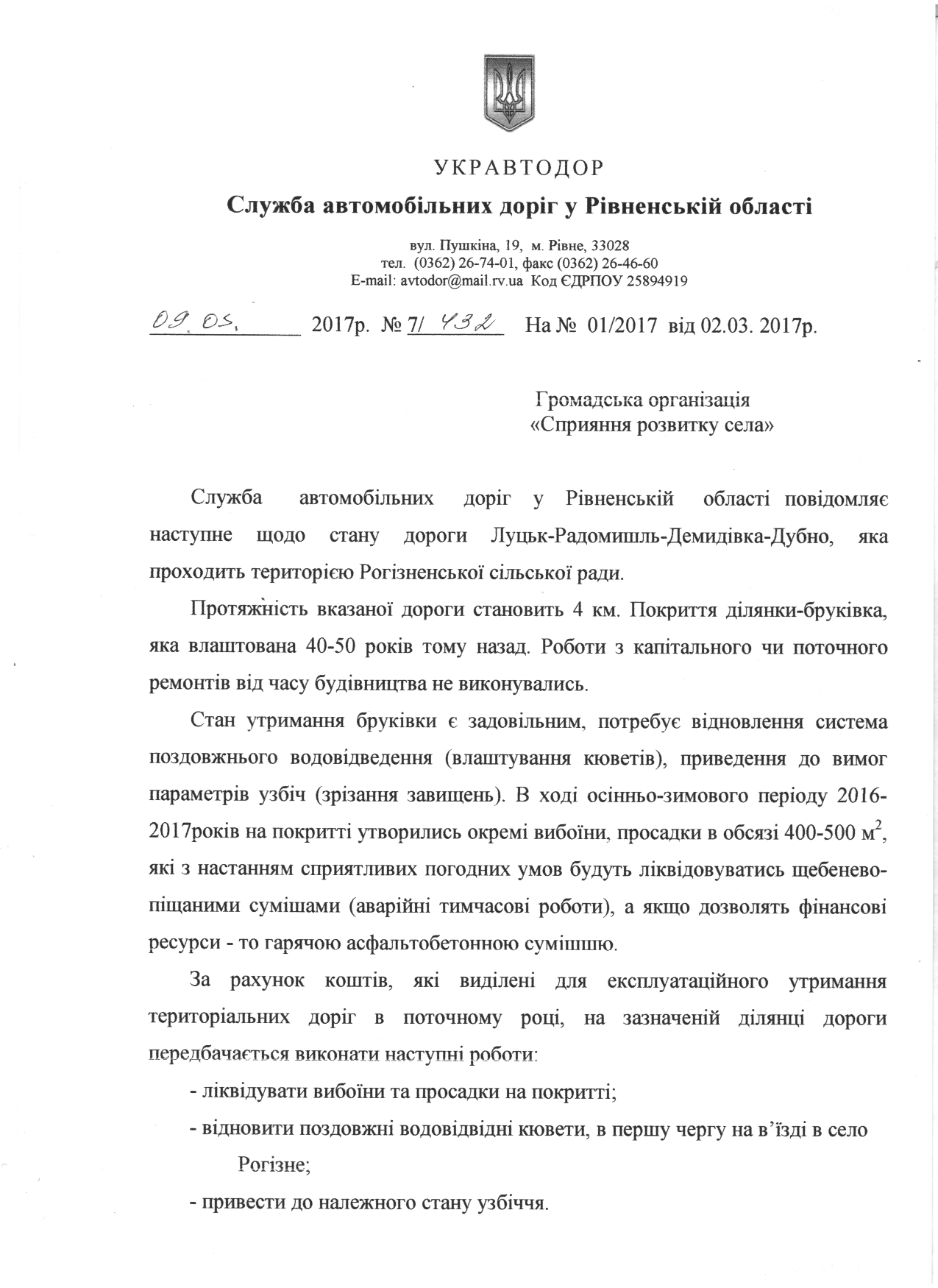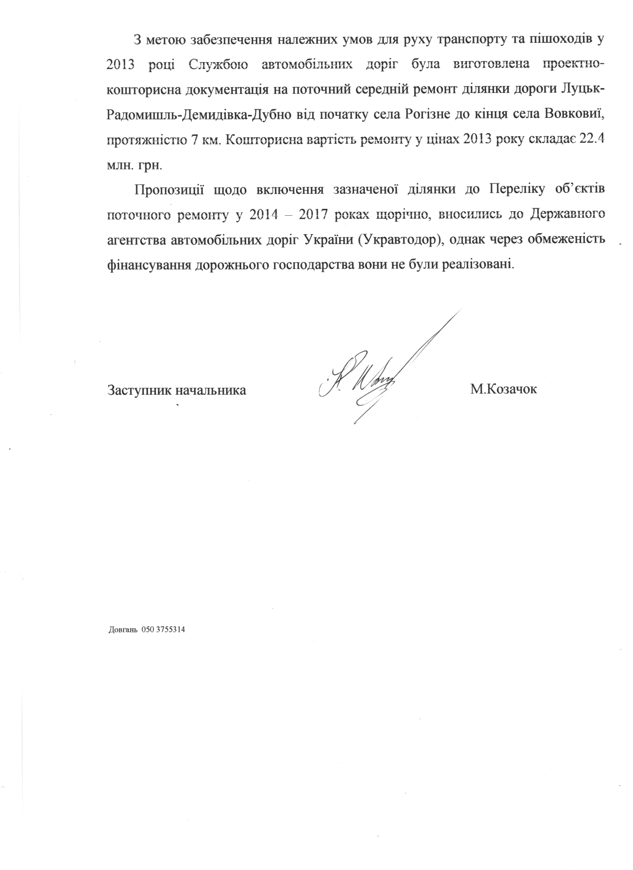 У нас зібралась ціла тека різних відписок і формальних відповідей, а робіт ніяких не виконується. Всім байдуже на дорогу, яка з’єднує три райони – Демидівський, Млинівський і Дубенський”, – каже Сергій Щербатюк.