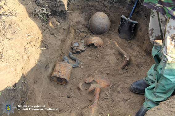 «Разом із працівниками поліції ми виїхали на вказане місце, — зазначає представник організації Михайло Баланович. — Розкопали глибше і дійсно знайшли цілий кістяк середнього зросту чоловіка, а також рештки військової амуніції: шолом, рештки протигазу, дрібні ґудзики, пряжки».