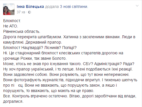 Стаціонарний блокпост клесівські старателі встановили дорогою на урочище Рожки, так зване Болото. Про це пише на своїй сторінці у Фейсбуці рівненська журналістка Інна Білецька: