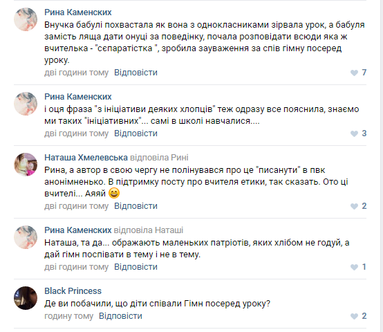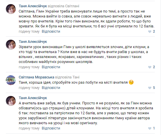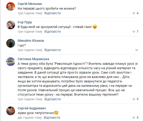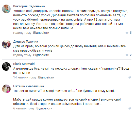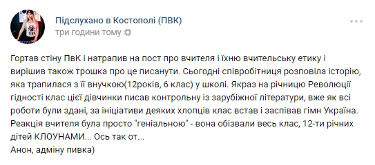 Цікавий допис з’явився сьогодні, 24 листопада у спільноті Підслухано в Костополі (ПВК) . У ньому йдеться про те, що у одній з костопільських шкіл, вчителька обізвала дітей клоунами за гімн України, який вони заспівали на уроці.bezy-myanny-jЩе цікавішою виявилась реакція читачів спільноти, які стали коментувати дану подію.bezy-myanny-j6 bezy-myanny-j5 bezy-myanny-j3 bezy-myanny-j1