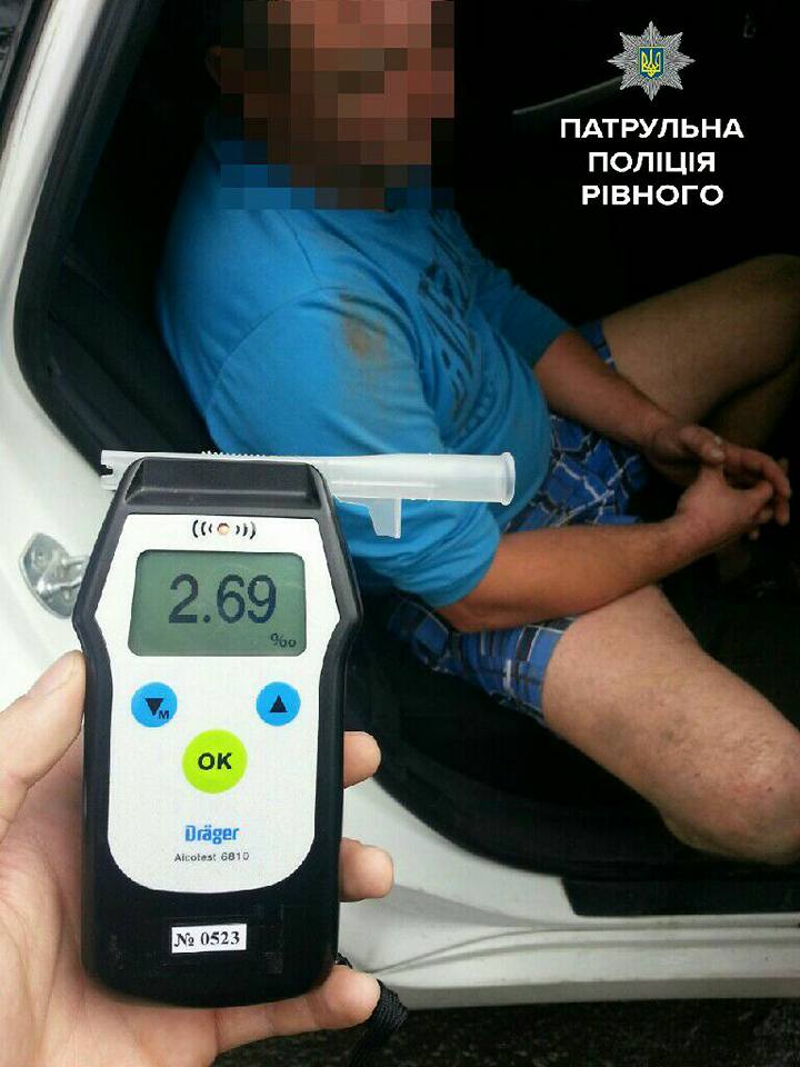 Водій мав явні ознаки алкогольного сп’яніння та погодився пройти освідування на місці зупинки автомобіля у присутності двох свідків. Результат тесту – 2,69 проміле, що в 13 разів перевищує норму.