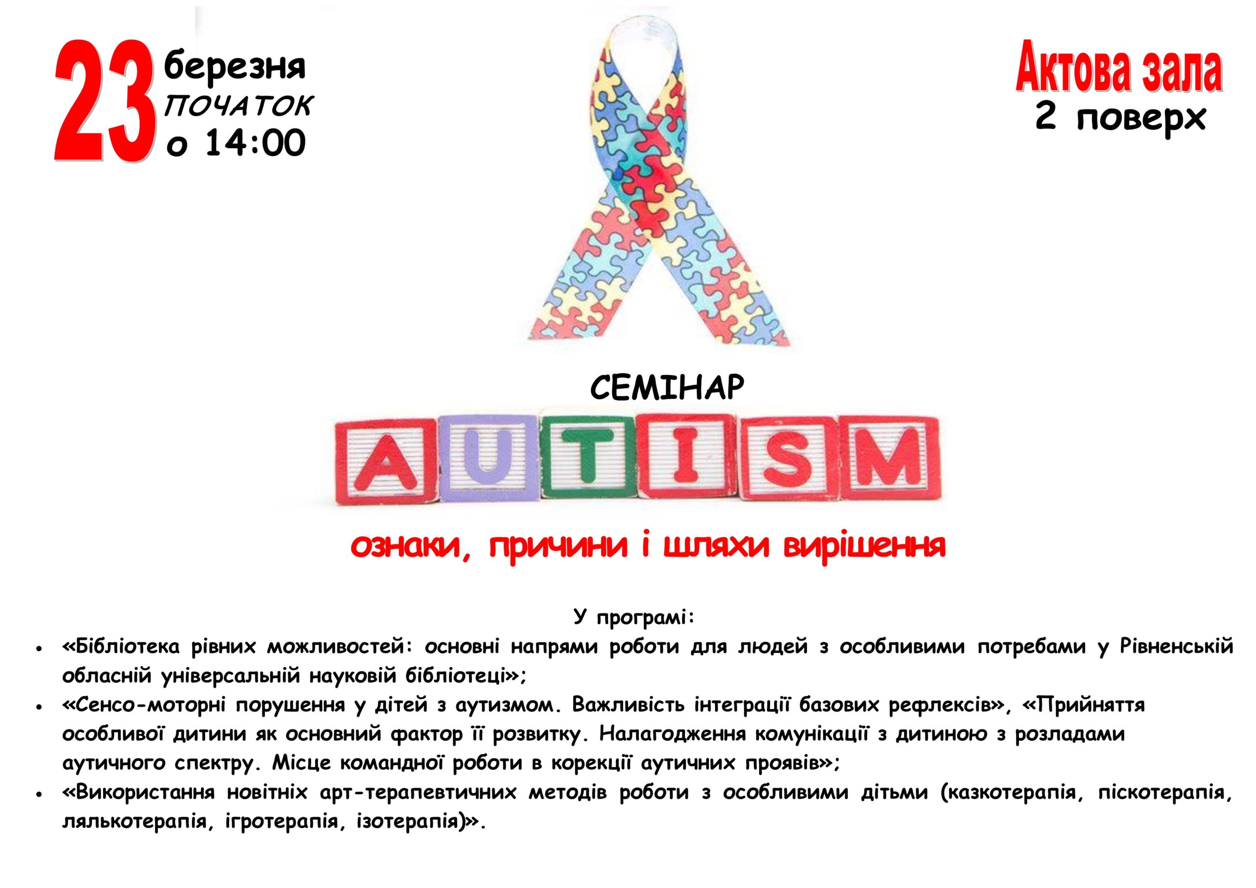 Напередодні Міжнародного дня поширення інформації про аутизм, 23 березня о 14:00 у Рівненській обласній універсальній науковій бібліотеці (вул. Короленка, 6) відбудеться семінар «Аутизм: ознаки, причини, труднощі та шляхи вирішення».