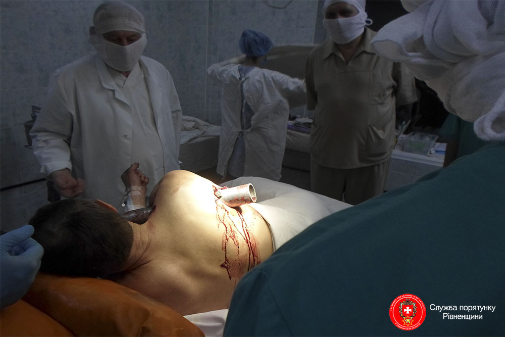 «Спочатку виконали серцево-судинні хірурги, потім ми виконали свій об’єм операцій, потім забрали оцю трубу і потім хворий був переведений у відділення реанімації, де зараз і перебуває», – каже Віктор КУЗЬМІЧ, завідувач тора кальним відділенням Рівненської обласної лікарні.