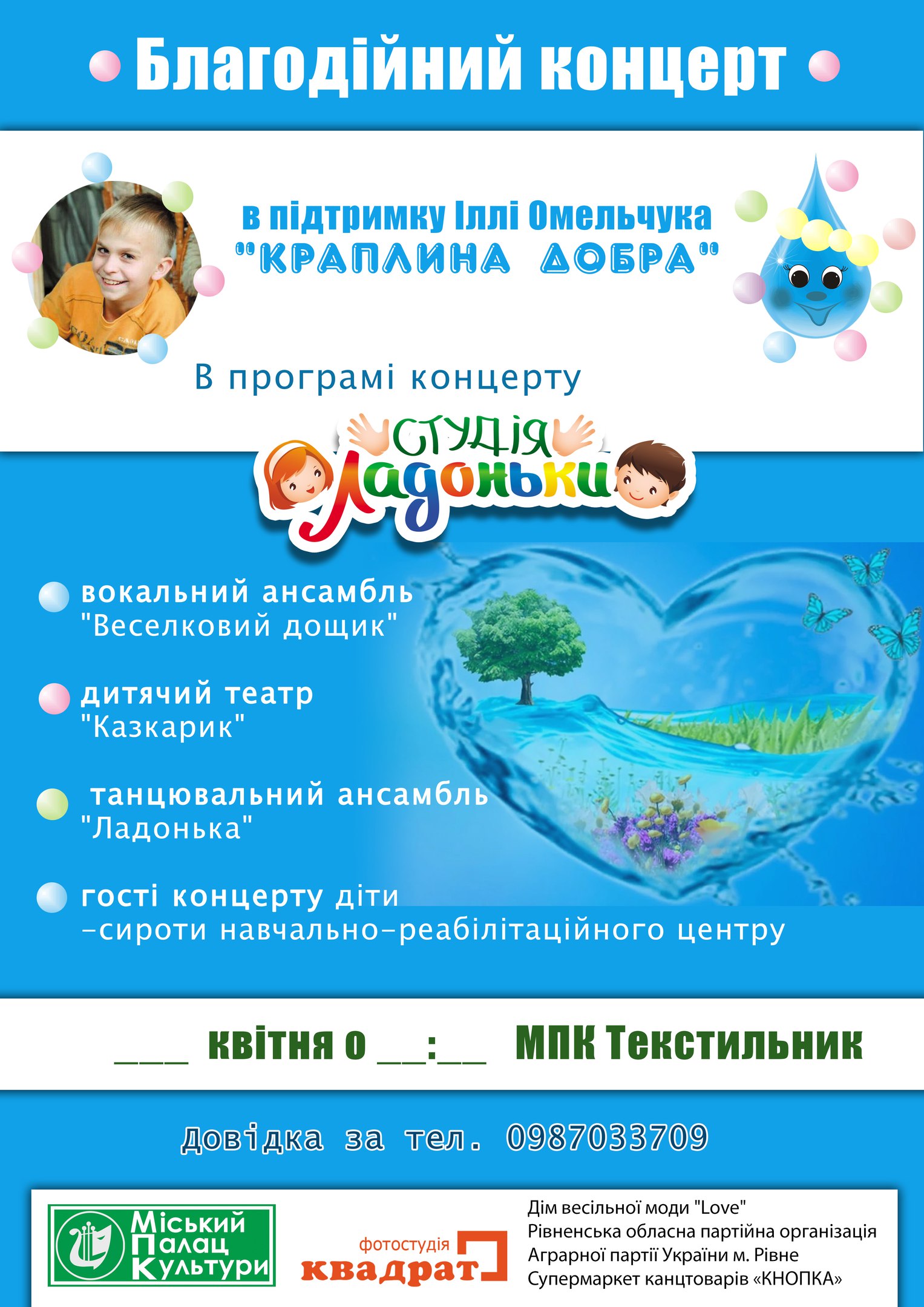 2-3 квітня о 14.00 запрошуємо всіх небайдужих батьків долучитись до благодійного концерту “Краплина добра” в підтримку Іллюши Омельчука… Концерт для школярів та діток дитячих садочків, благодійний внесок 20 грн.