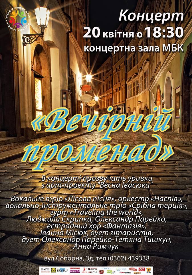Весна… Час для першого лагідного сонечка, ніжних почуттів, несміливих трепетних обіймів. Вулиці міста наповнюються людьми у пошуках романтичного настрою, а ще так хочеться закутатись у ці затишні весняні вечори! Залиште турботи, холод, сірість у минулому і вирушайте 20 квітня у «Вечірній променад» мотивами релаксуючої музики разом з колективами Міського Будинку Культури! Для вас співатимуть дівчата-красуні з тріо «Лісова пісня», гратиме неймовірний оркестр «Наспів» та тріо «Срібна терція», симбіоз різноманітних музичних інструментів та джазового виконання від гурту «Traveling the world», найкращі вокалісти – Анна Римчук, Іванна Місюк, Олександр Парейко та багато інших. А ще буде можливість ще раз насолодитись найяскравішими номерами з арт-проекту «Весна Івасюка».