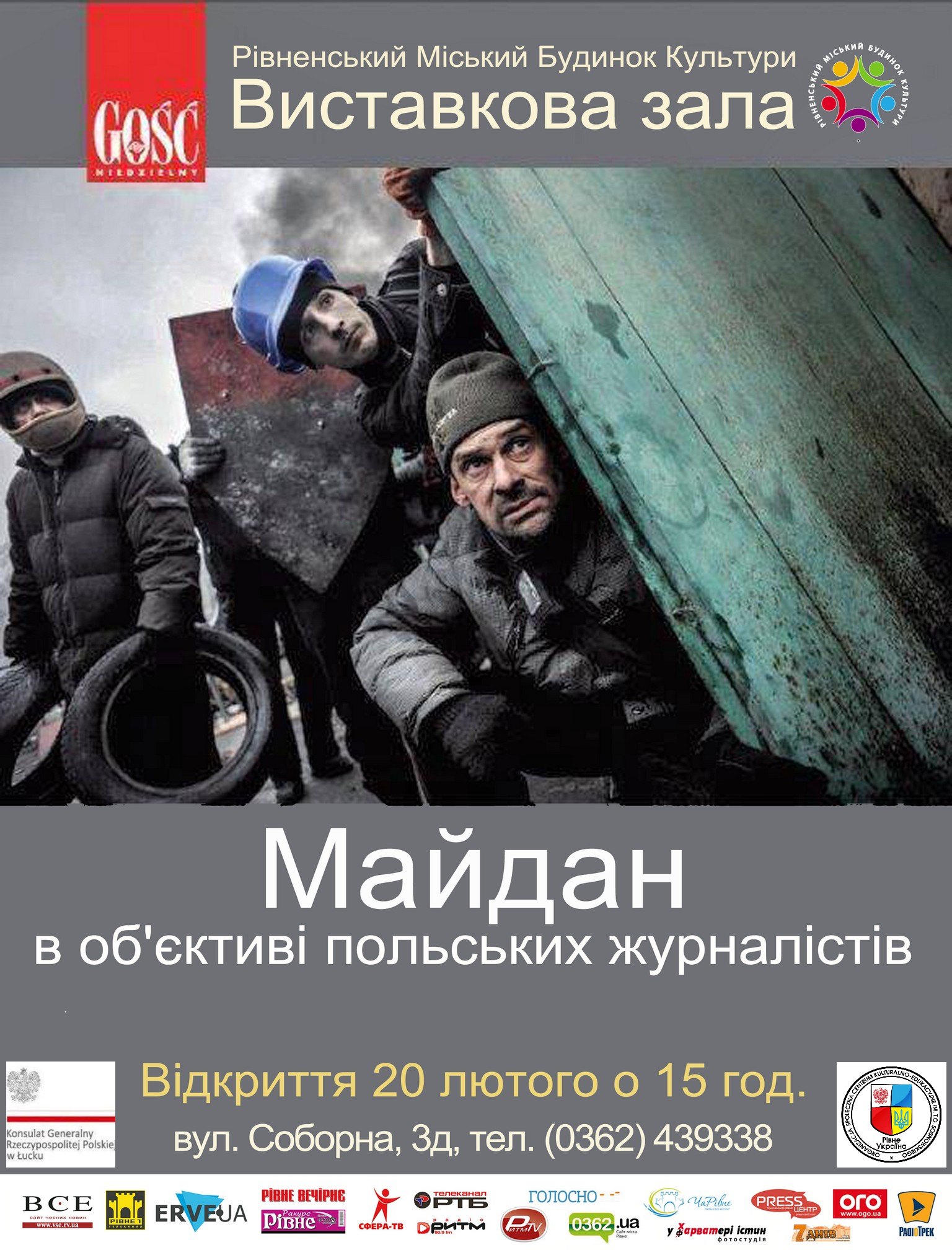 20 лютого до Дня Героїв Небесної Сотні у Виставковій залі Рівненського Міського Будинку Культури відбудеться відкриття виставки “Майдан в об’єктиві польських журналістів”. Дана виставка є проектом Українсько-польського культурно-просвітницького центру ім. Томаша Сосновського за сприяння Посольства Республіки Польща у Києві та Генерального Консульства Республіки Польща у Луцьку.
