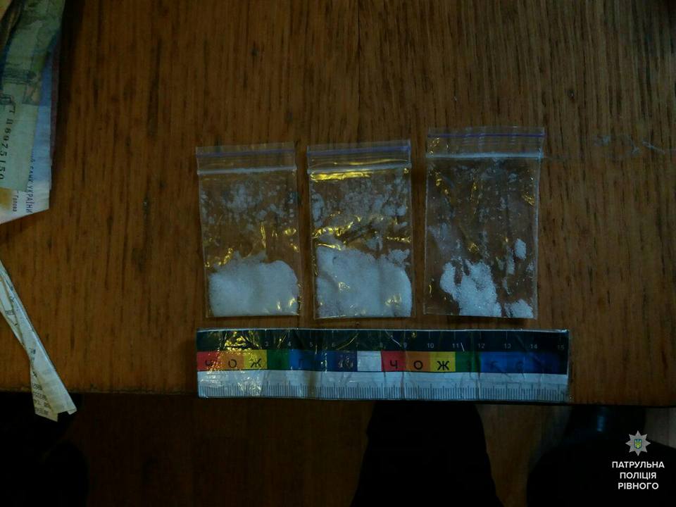Відносно невідомого полісмени застосували фізичну силу та спецзасіб кайданки. Особу чоловіка встановили та освідували у медичному закладі у лікаря-нарколога. Пізніше 28-річний рівнянин зізнався охоронцям порядку, що має при собі речовини, обіг яких заборонений на території України. На місце події прибули слідчі, які виявили у затриманого три поліетиленові пакети з порошкоподібною речовиною білого кольору, зовні схожою на наркотичну.