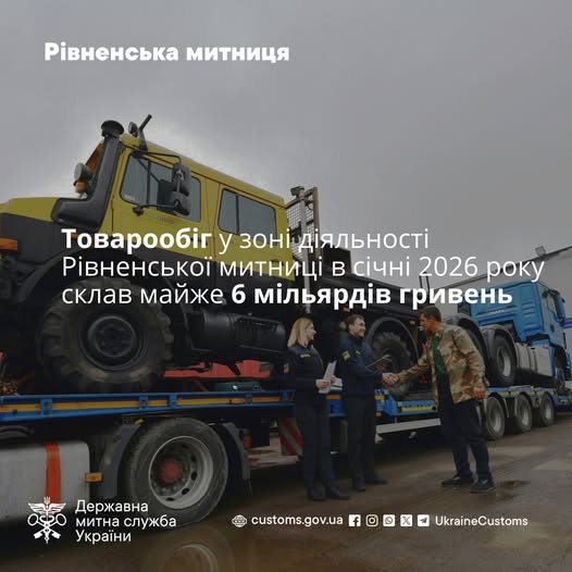 Товарообіг у зоні діяльності Рівненської митниці в січні 2026 року склав майже 6 мільярдів гривень