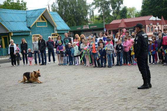Пiсля ознайомлення з особливостями служби в рiзних пiдроздiлах полiцiї, кінологи продемонстрували дітям навики роботи поліцейський собак.