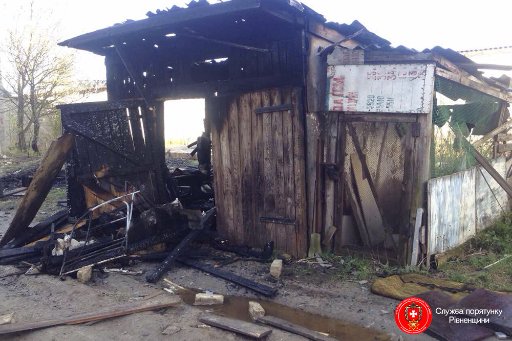 12 квітня о 03:03 до Служби порятунку Рівненщини за номером «101» надійшло повідомлення про пожежу в приватному господарстві за адресою місто Костопіль вулиця Рівненська. До місця події було негайно направлено чергове відділення 19-ї державної пожежно-рятувальної частини районного центру. Прибувши за вказаною адресою рятувальники встановили, що вогнем охоплено господарчу будівлю по усій площі та існує загроза розповсюдження полум’я на поруч розташований гараж. На гасіння було подано один водяний ствол. Пожежу локалізувано о 03:16, а ліквідовано о 04:23. Вогнем знищено господарчу будівлю. До гасіння залучалася одна одиниця техніки та 5 чоловік особового складу рятувальників. Причина пожежі встановлюється.
