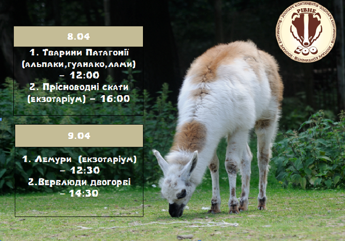 Цими вихідними у Рівненському зоопарку продовжиться традиція показових годівель тварин. Так, у суботу годуватимуть тутешніх альпак, гуанако та лам. На очах у відвідувачів пригостять вечерею і скатів.