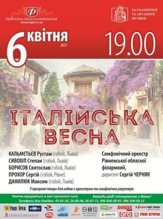 6 квітня о 19.00 годині симфонічний оркестр Рівненської обласної філармонії та учні Львівської музичної школи-інтернату ім. Соломії Крушельницької, клас викладача доцента РДГУ Заслуженого діяча мистецтв України Левка Закопця запрошують на концерт «Італійська весна».