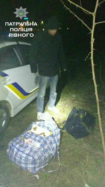 17554087_999497003518225_7033985641425832105_nСьогодні вночі, близько 1-ї ночі, на вулиці Соборній екіпаж патрульної поліції помітив 2 підозрілих осіб з великими повними валізами. Коли чоловіки побачили патрульний автомобіль, вони різко змінили напрямок руху і почали в тікати в бік вулиці Хмільної та залізнодорожніх колій. Під час переслідування одну особу патрульні зупинили: він ніс 2 сумки, а інший тим часом зник в напрямку ринку Дикого та вулиці Здолбунівської.