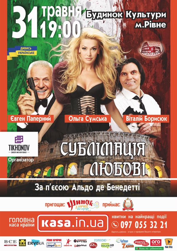 31 травня о 19:00 на сцені Міського Будинку Культури відбудеться надзвичайна комедія на 2 дії за п’єсою італійського драматурга Альдо де Бенедетті – «Сублімація любові»!