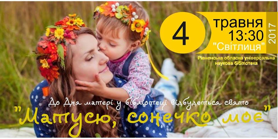 Цього четверга, 4 травня, о 13:30 у «Світлиці» Рівненської обласної універсальної наукової бібліотеки (вул. Короленка, 6) відбудеться свято до Дня матері «Матусю, сонечко моє» з вихованцями Рівненського навчально-реабілітаційного центру «Особлива дитина».