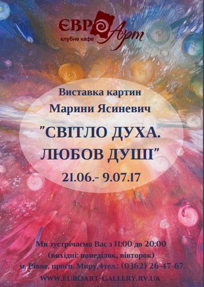 Персональна виставка Марини Ясиневич «Світло Духа. Любов Душі» продовжує широкомасштабний проект галереї «Євро-Арт» для талановитих». Експозиція налічує 23 картини, виконані на полотні в техніці акрилового живопису. Картини енергетичні та приваблюють своїм прекрасним звучанням кольору («Світанок Жіночності», «Цвітіння коралів», «Народження Світла», «Союз Галактик», «Зустрічі. Люди», «Жіноче тепло»).