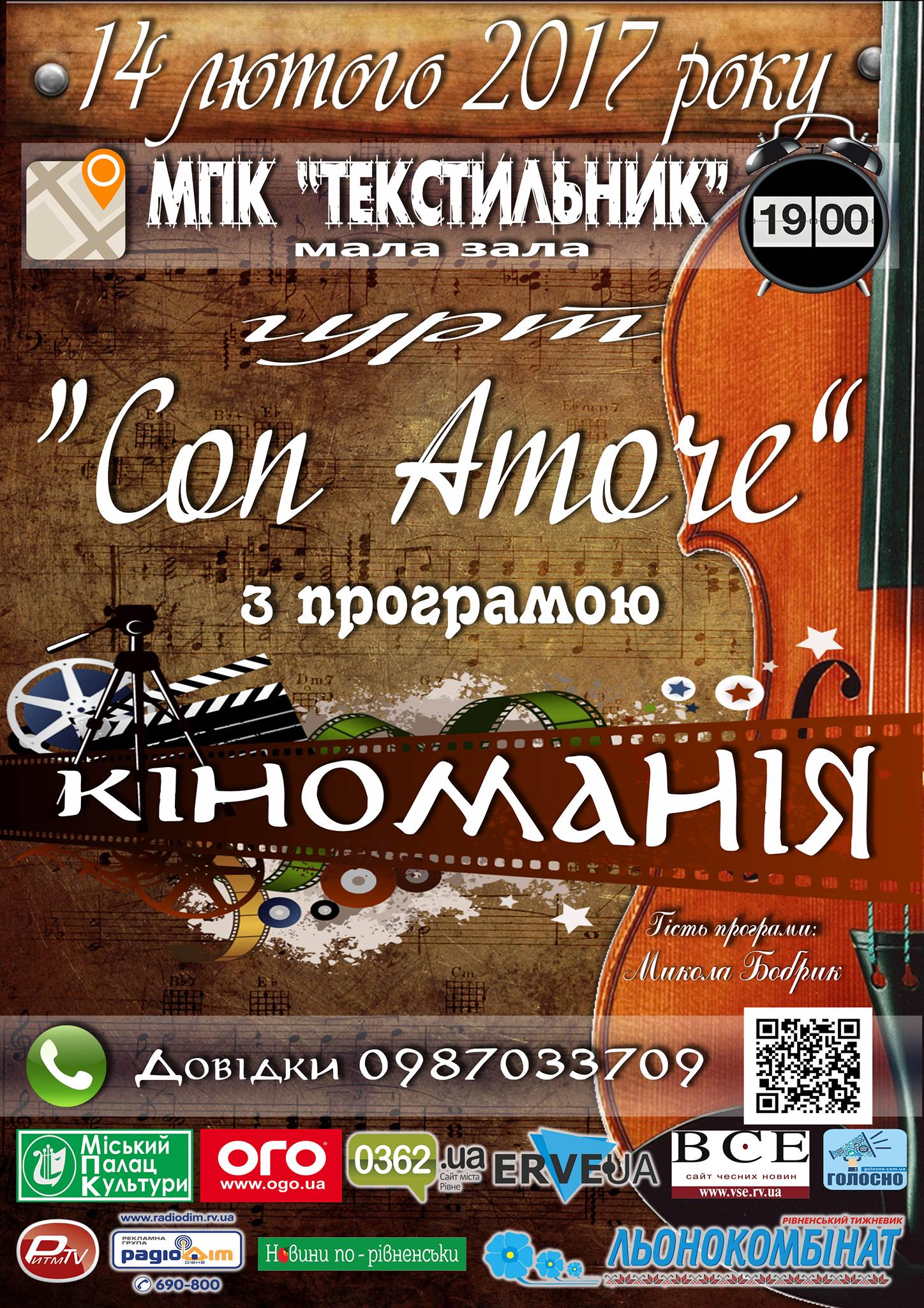 Ви плануєте здивувати кохану людину на День закоханих? Але не знаєте як? В нас є ідея! Запрошуємо на вечір кіономаніїї в міському палаці культури. Уявіть собі улюблений фільм без музичного супроводу. А які емоції виникають, коли звучить “He is a pirate” з ” Піратів Карибського моря”? Кінематографічна музика давно вже вийшла за межі кінозали. Гурт “Con Amore” запрошує насолодитися відомими саундтреками, володарями “Оскара” та “Ґремі”, каверами естрадних хітів та класичними творами, якими режисери прикрашали свої стрічки. Такого Ви ще не бачили ! Дивовижна гра гурту”Con Amore” в поєднанні з відеотрансляцією уривків з відомих фільмів – це буде неперевершено! 14 лютого о 19.00 в міському палаці культури .Довідки за тел 0987033709