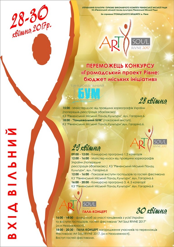 З 28 по 30 квітня 2017 у Рівному відбудеться Всеукраїнський дитячий, молодіжний хореографічний фестиваль «ART SOUL Rivne – 2017» – переможець конкурсу «Громадський Проект Рівне: Бюджет міських ініціатив», за участі кращих хореографічних колективів України.