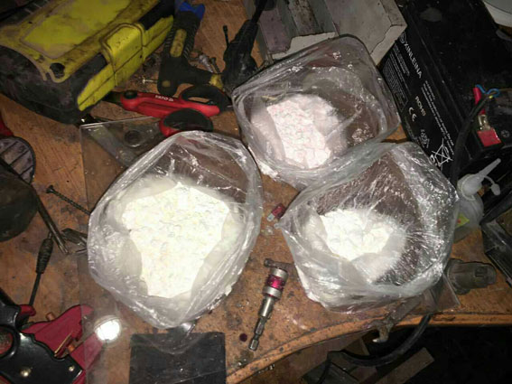 В одній із пластикових банок правоохоронці виявили три пакети із білою порошкоподібною речовиною, зовні схожою на метамфетамін, вартість якого за цінами «чорного» ринку становить близько 150 тисяч гривень.