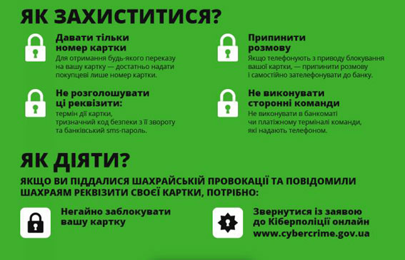 Ключовий спосіб захисту від телефонних шахраїв – це негайно припинити розмову, якщо вас почали питати реквізити картки (не тільки номер, але також термін її дії, тризначний код безпеки і смс-паролі з банківських повідомлень).